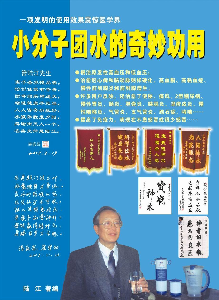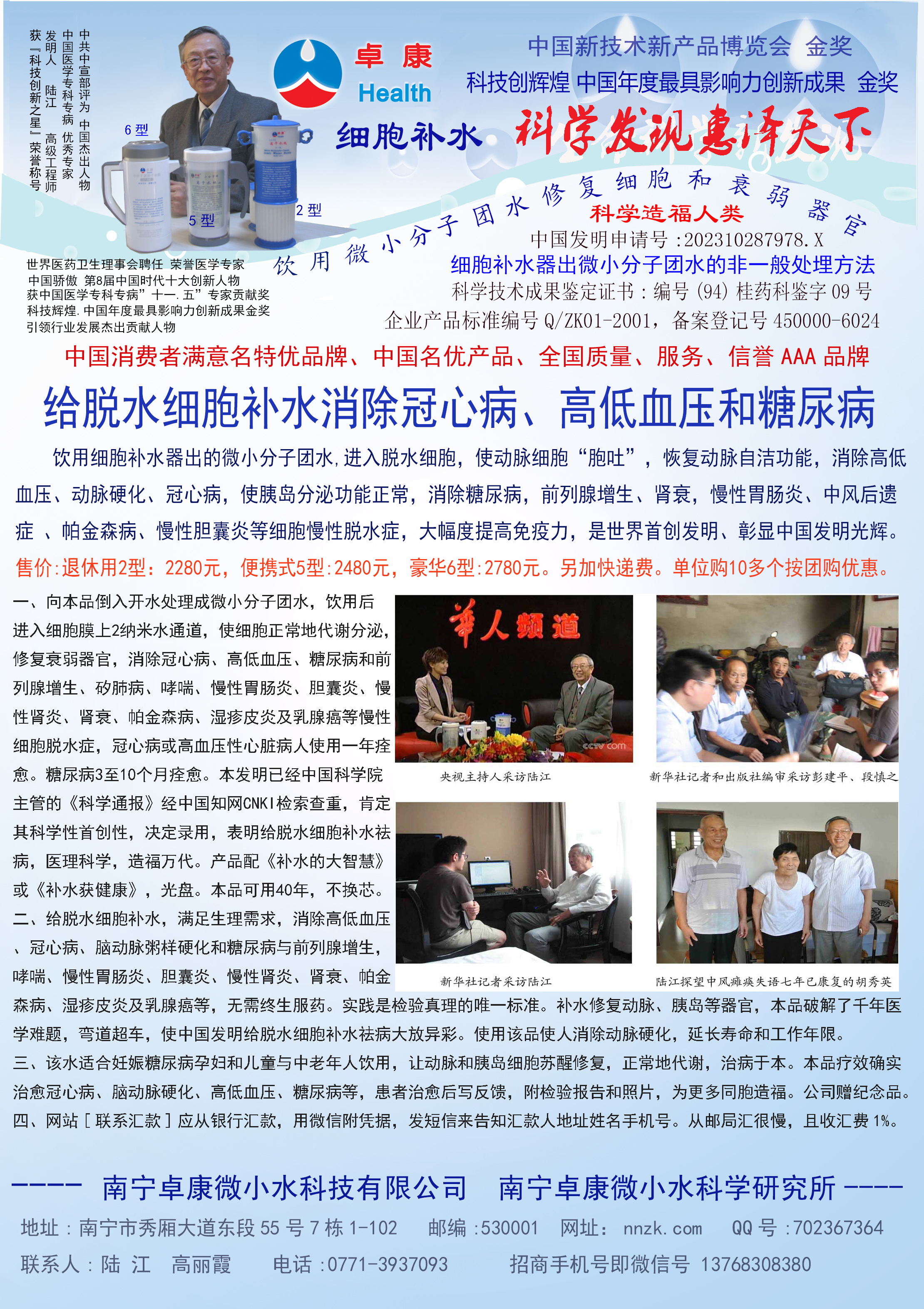 人類幾千年來患以上病癥需終生服藥,幾十年也不能治愈??墒俏覈蠈幍母呒壒こ處熽?nbsp;江,于1990年想根治高血壓,研究發(fā)明了離子水瓶,處理出微小分子團水供飲用,經(jīng)過醫(yī)院臨床試用和專家鑒定,1999年獲中國發(fā)明專利權,產(chǎn)品于2000年投放市場后一直跟蹤調查,據(jù)全國各地用戶反饋:祛除了高低血壓、糖尿病和冠心病,并使前列腺增生、咽喉炎、鼻竇炎、慢性氣管炎、支氣管炎、矽肺病、哮喘、慢性胃炎、腸炎、慢性膽囊炎、慢性腎炎、腎衰、膀胱炎、便秘、痔瘡、風濕性關節(jié)炎和濕疹皮炎及中風后遺癥等病癥不藥而愈。為什么喝微小水能治20多種病?陸 江從1991年德國科學家發(fā)現(xiàn)細胞膜水通道僅為2納米獲得啟發(fā),認為多種器官患病是因細胞脫水,不能正常代謝和分裂增殖,才使器官細胞減少致衰弱萎縮而形成細胞缺水性病癥。22年來的實踐有力地支持了“細胞脫水致病”這一重要論點,表明喝微小水可滿足細胞的生理需求,補水就能祛病,是生命科學新亮點。
