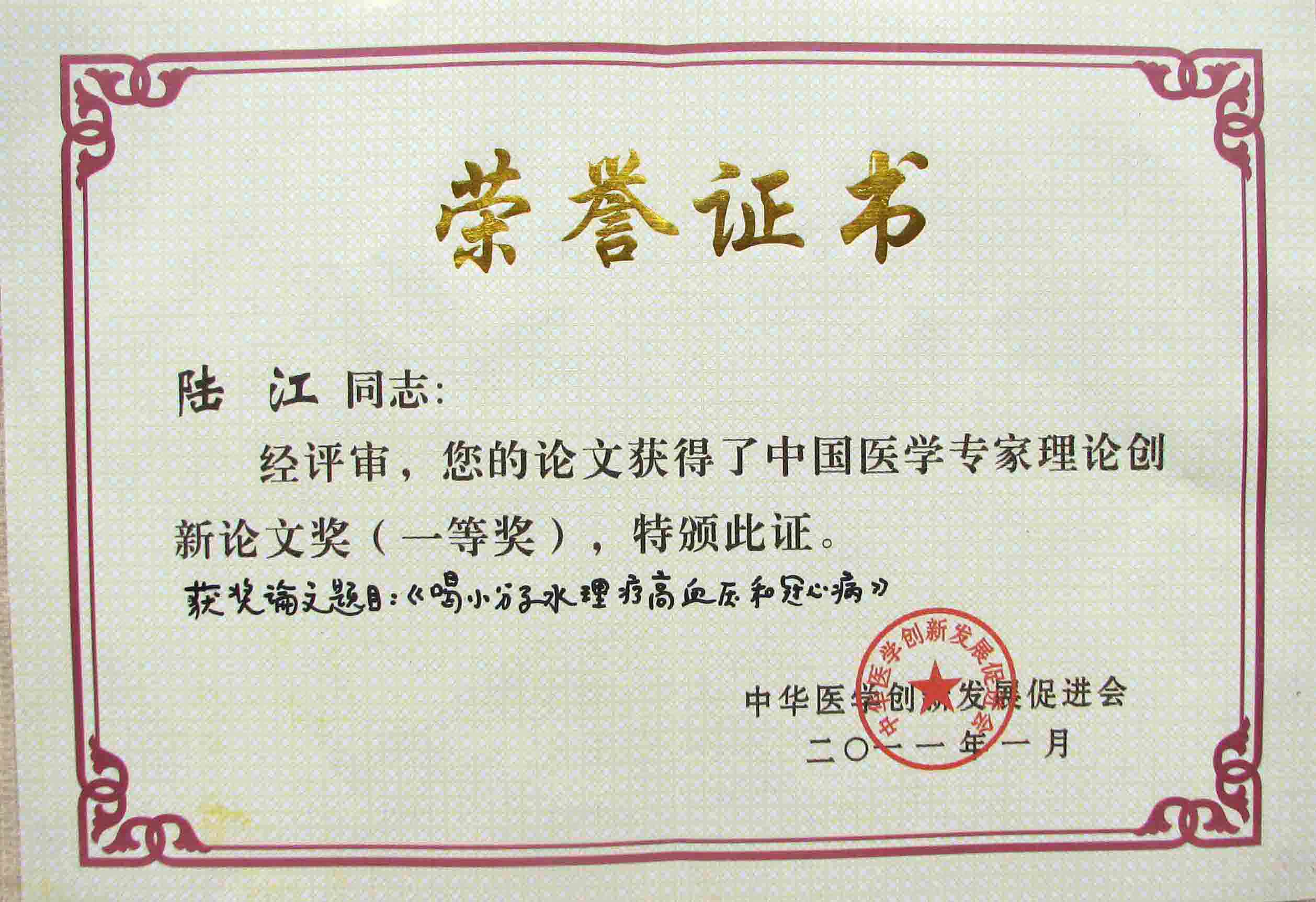 新疆63歲的賀兆生飲用一年,冠心病未愈,他用電話介紹是食堂管理員,問他食量多少?說吃七八分飽,睡前還吃兩袋牛奶,陸 江說我在論文和書中多次批判“吃七八分飽”,關照患者務必用“己饑方食”控制主食肉食量,要他把牛奶改在早中餐吃,減少主食肉食量,建議不吃晩餐,晚上只吃一個蘋果,再經(jīng)幾個月補水節(jié)食,治愈了21年的冠心病和肥胖、失眠等病,信中由衷地感激陸 江為再生父母。[13]因為醫(yī)生從未過問他的膳食習慣,只管開處方藥或手術,父母也不會叫他不吃晩飯。